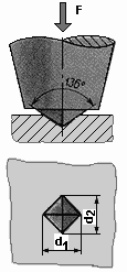 Tvrdost podle Vickerse (ČSN 42 0374) - do materiálu se vtlačuje pod zatížením silou F (působí kolmo na povrch vzorku) diamantový pravidelný čtyřboký jehlan o daném vrcholovém úhlu mezi protilehlými stěnami po danou dobu. Následně se změří střední délka u obou úhlopříček vtisku. Zkušební zatěžující síla bývá od 10 do 1000 N. Doba zatížení se volí od 10 do 180 s. Použité zatížení píšeme do označení, např. HV 100 (HV 100 = 215).