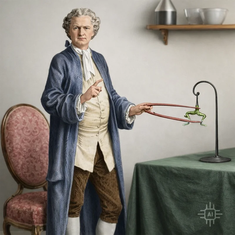 V roce 1791 Galvani zjistil, že se žabí noha stahuje při dotyku bimetalového vodiče z mědi a zinku: